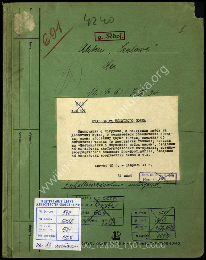 Top Фонд 500 Опись 12488 - Документы по операции "Морской лев" Дело 1501: Документация 12-й роты 34-го пехотного полка: инструкции...
