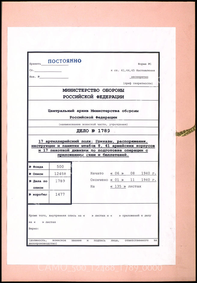 Дело 1789: Документация Ia-департамента 17-го артиллерийского полка: указания 17-й пехотной дивизии по проведению учений к операции «Морской лев», приказы по проведению учений полка, инструкции испытательного штаба R и т.д.