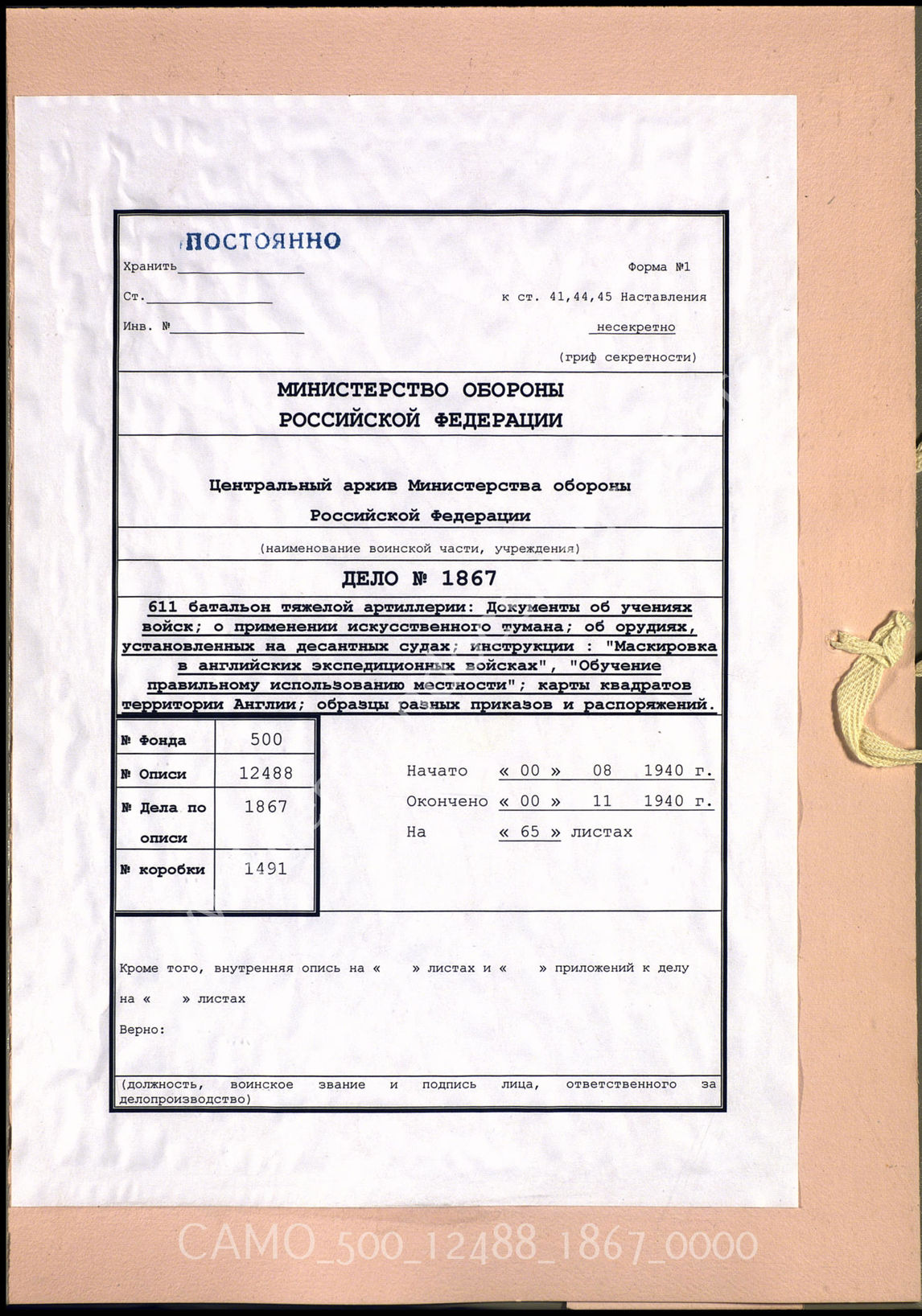 Дело 1867: Документы оперативного отдела 611-го артиллерийского дивизиона большой мощности: служебная переписка т распоряжения по погрузочным учениям, данные о британских вооруженных силах, распоряжение ОКХ о ведении боя в условиях дымовой завесы и т.д.