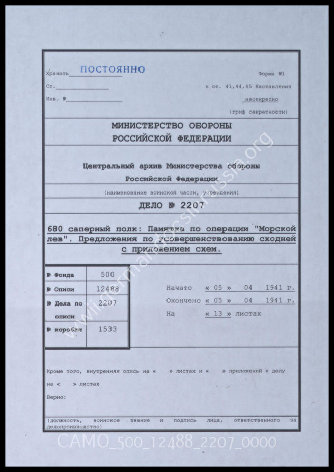 Top Фонд 500 Опись 12488 - Документы по операции "Морской лев" Дело 2207: Документация Ia-департамента 680-го инженерного полково...