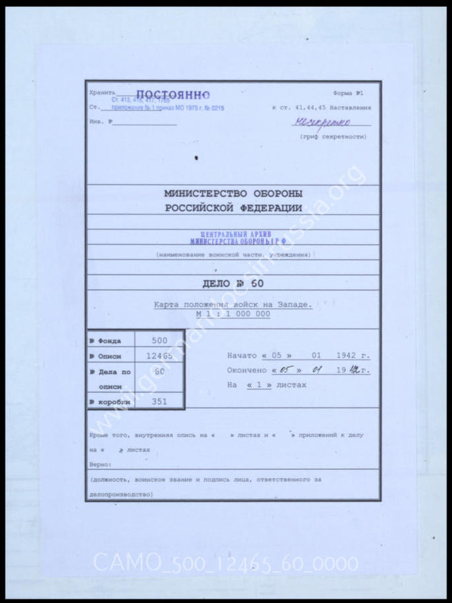Дело 60: Документация департамента оперативного управления IIIb Генерального штаба сухопутных войск: карта расположения Западной армии на 5.1.1942, M 1:1.000.000