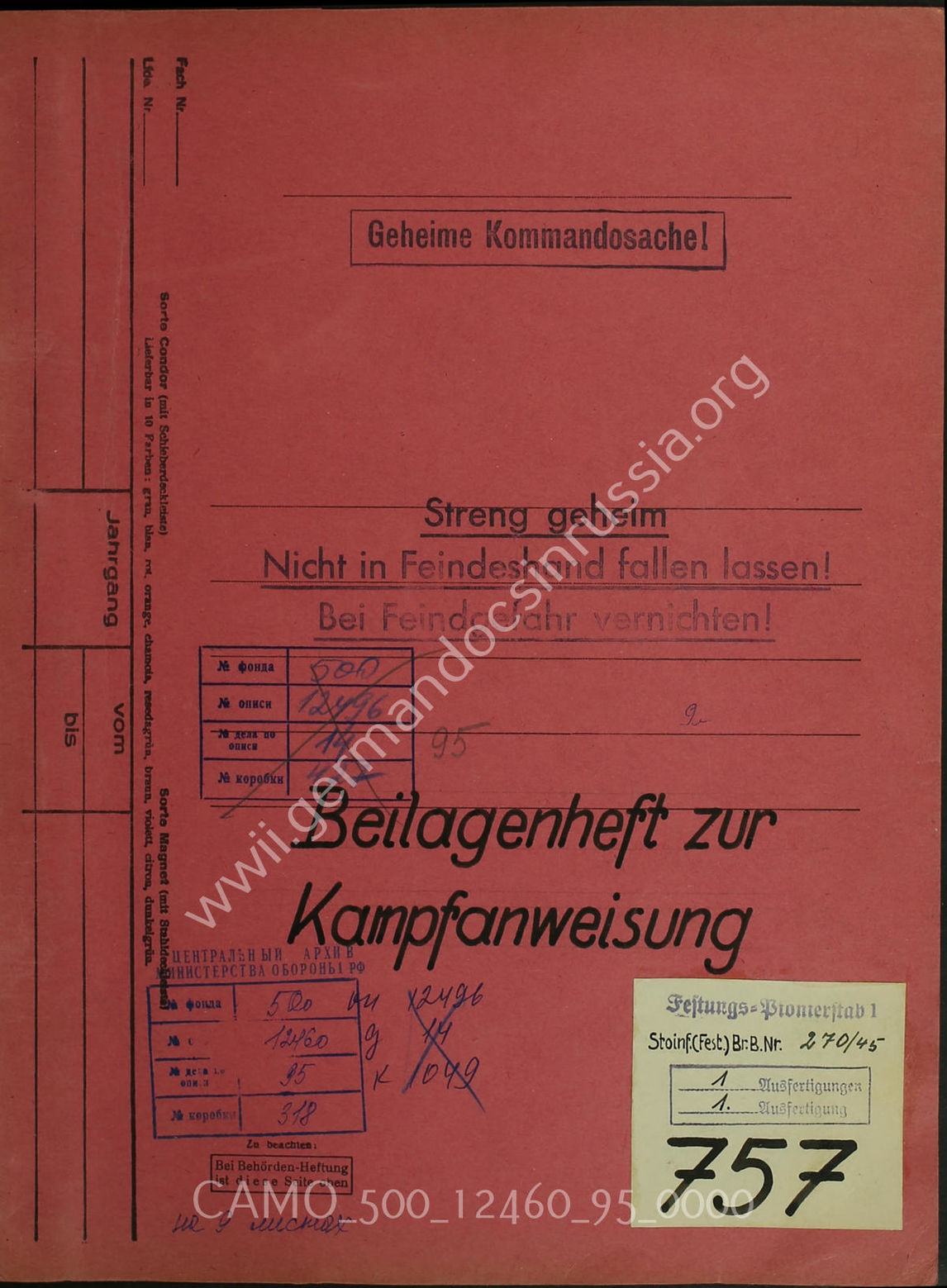 Дело 95: Документация Ia-департамента 1-го штаба крепостной инженерной части: брошюра с приложениями к наставлению по ведению боя для 757-го бронированного оборонительного сооружения