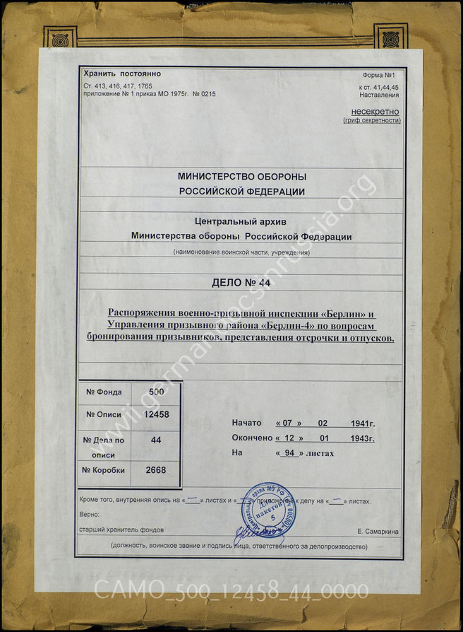 Дело 44: Документация офицера военного округа Берлина Хорст-Весселя (4-е управление призывного района Берлина): инструкции по вопросам предоставления брони, обзор соответствующих распоряжений и постановлений и проч.