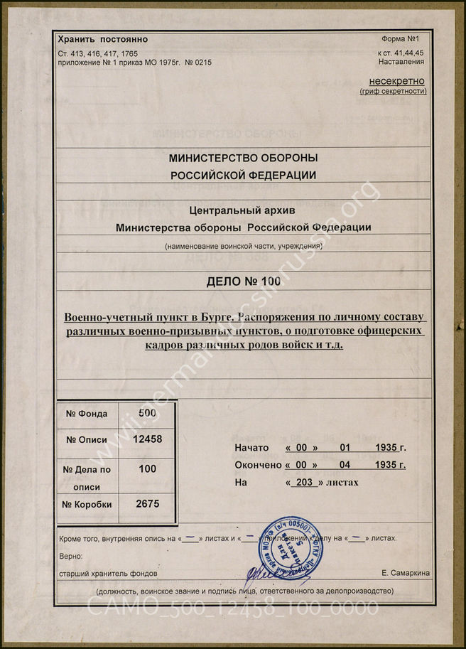 Top Фонд 500 Опись 12458 - Мобилизация и др. Дело 100: Документы призывного пункта в г. Бург: приказы ОКХ о прис...