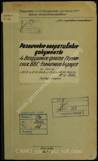 Дело 108: Документы военно-исторического управления Генерального штаба Вооруженных сил СССР: переводы различных оперативных документов 4-го воздушного флота и 1-го зенитного корпуса за период 30.08.-08.11.1942 г. и 18.12.1943 -15.01.1944 гг.