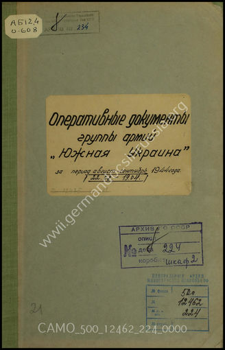 Дело 224: Документы военно-исторического управления Генерального штаба Вооруженных сил СССР: перевод документов оперативного отдела группы армий «Южная Украина» – приложения к ЖБД группы армий «Южная Украина», том 4, 22.08.1944-19.09.1944 г.