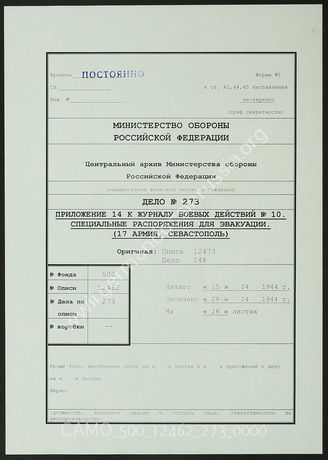 Дело 273: Документы военно-исторического управления Генерального штаба Вооруженных сил СССР: перевод документов оперативного отдела штаба 17-й армии – приложение № 14 к жбд №10 17-й армии, 15.04.1944-28.04.1944 г.