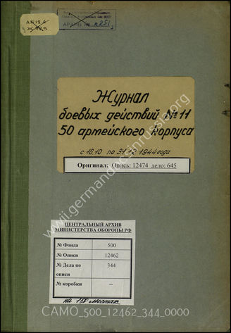 Дело 344: Документы военно-исторического управления Генерального штаба Вооруженных сил СССР: перевод документов оперативного отдела 50-м армейским корпусом – жбд корпуса № 11, 16.10.1944-31.12.1944 г.