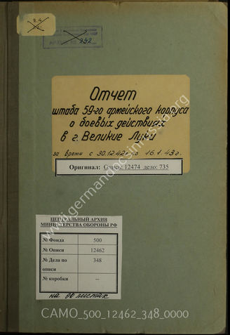 Дело 348: Документы военно-исторического управления Генерального штаба Вооруженных сил СССР: перевод документов оперативного отдела 59-м армейским корпусом – отчет о действиях в г. Великие Луки за время с 30.12.1942 г. по 16.01.1943, ч. 1, 09.02.1943 г.