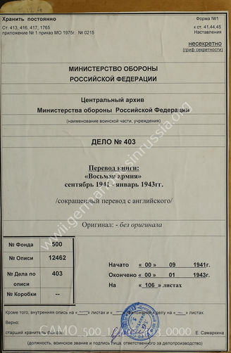 Дело 403: Документы военно-исторического управления Генерального штаба Вооруженных сил СССР: сокращенный перевод книги «Восьмая Армия. Сентябрь 1941 г. – январь 1944 г.», Лондон 1944 г. – 2-й экземпляр