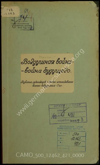 Дело 421: Документы военно-исторического управления Генерального штаба ВC СССР: перевод книги Фритца Ганденберга фон Мойзи: «Воздушная война – война будущего? Состав, организация и виды боевого применения военно-воздушных сил», Берлин 1935 г.