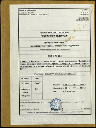 Дело 651: Документы военно-исторического управления ГШ ВC РФ: перевод документов отдела квартермейстера (II) штаба руководства вермахта в ОКВ – директива Гитлера о реорганизации командных отношений в районе группы армий «Север», 23.07.1944 г.