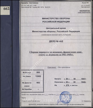 Дело 662: Документы военно-исторического управления Генерального штаба Вооруженных сил СССР: сборник переведенных статей, а также отрывков из книг, опубликованных в немецких и французских изданиях