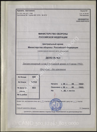 Дело 803: Документы военно-исторического управления Генерального штаба Вооруженных сил СССР: перевод дисциплинарного устава Германской армии, 06.06.1942 г.