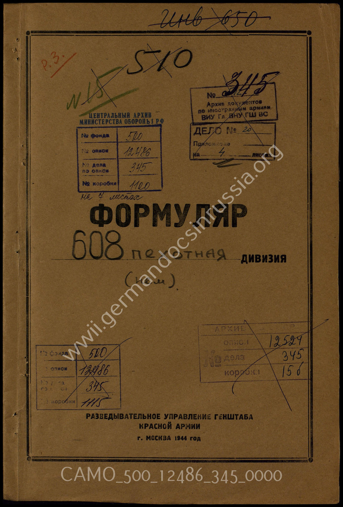 Дело 345: Документы Разведывательного Управления Генерального штаба Красной Армии: формуляры с развединформацией 608-й дивизии особого назначения, переведенный трофейные документ