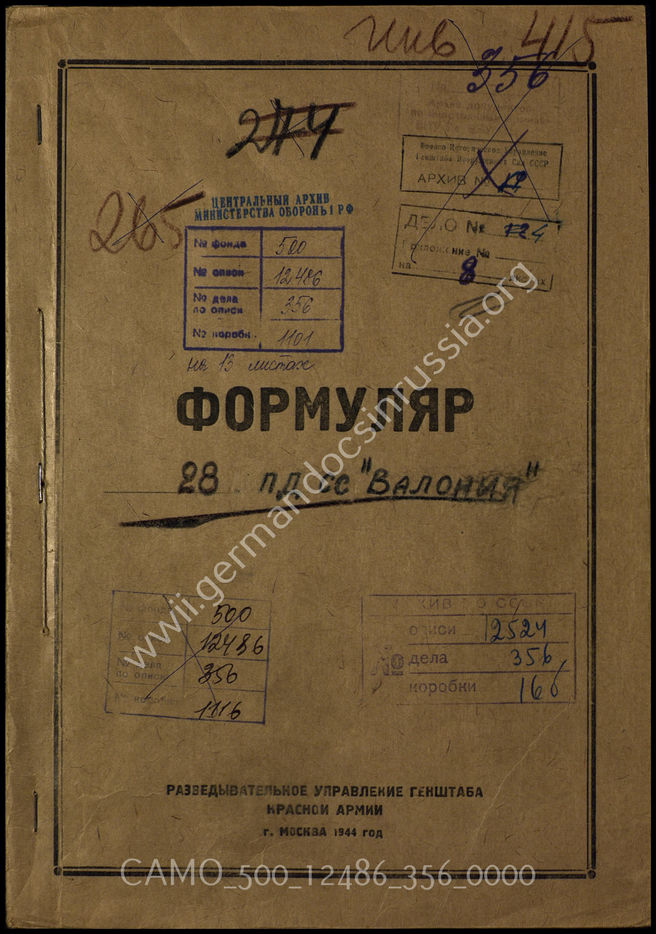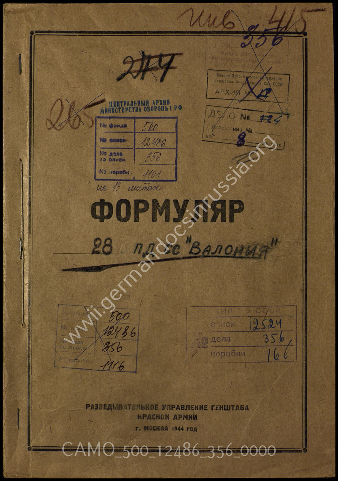 Дело 356: Документы Разведывательного Управления Генерального штаба Красной Армии: формуляры с развединформацией 28-й добровольческой гренадерской дивизии СС «Валлония», справочные данные, допрос военнопленного