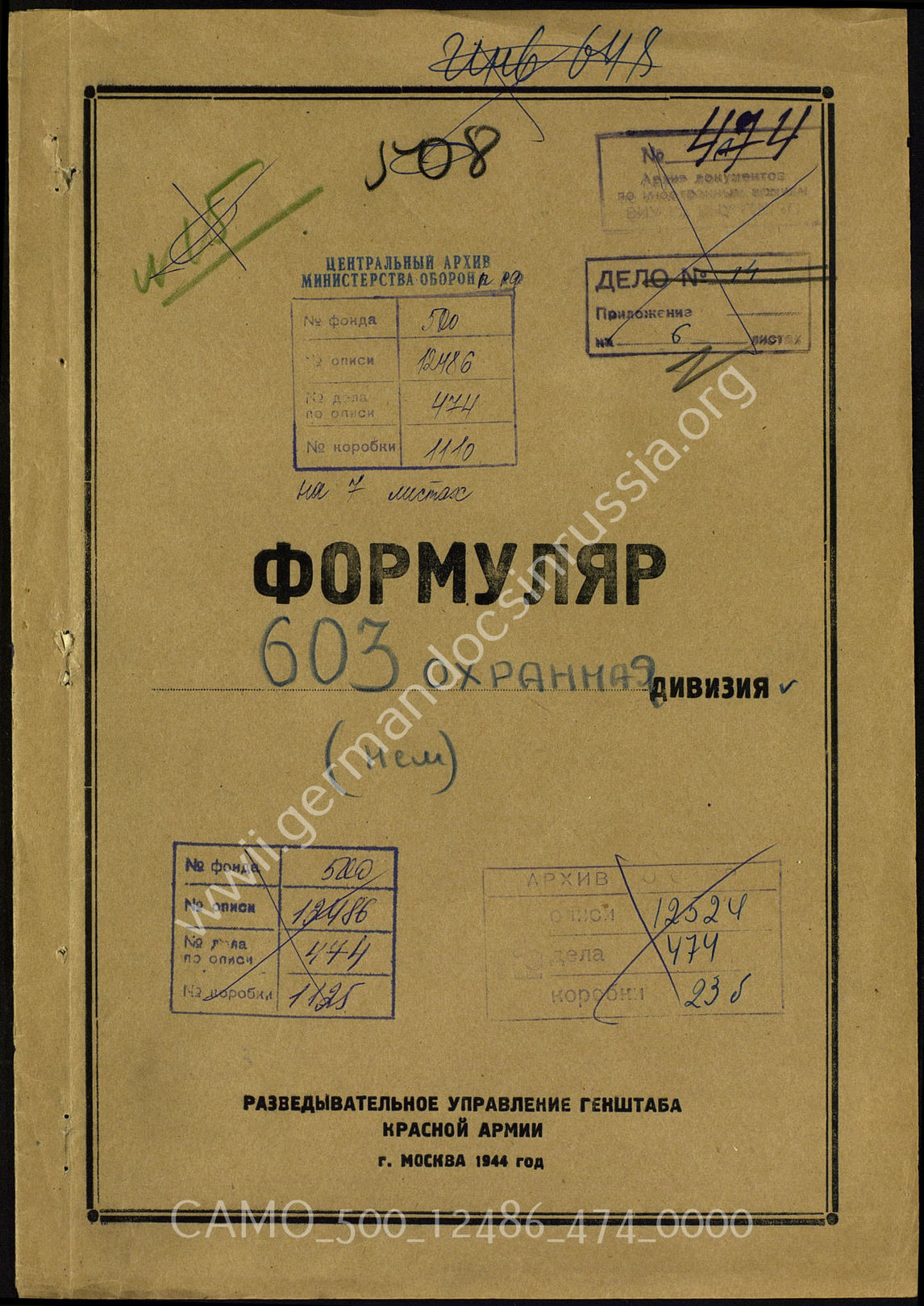 Дело 474: Документы Разведывательного Управления Генерального штаба Красной Армии: формуляры с развединформацией в штабе 603-й дивизии особого назначения (в советских документах называлась 603-й охранной дивизией), справочные данные и др.