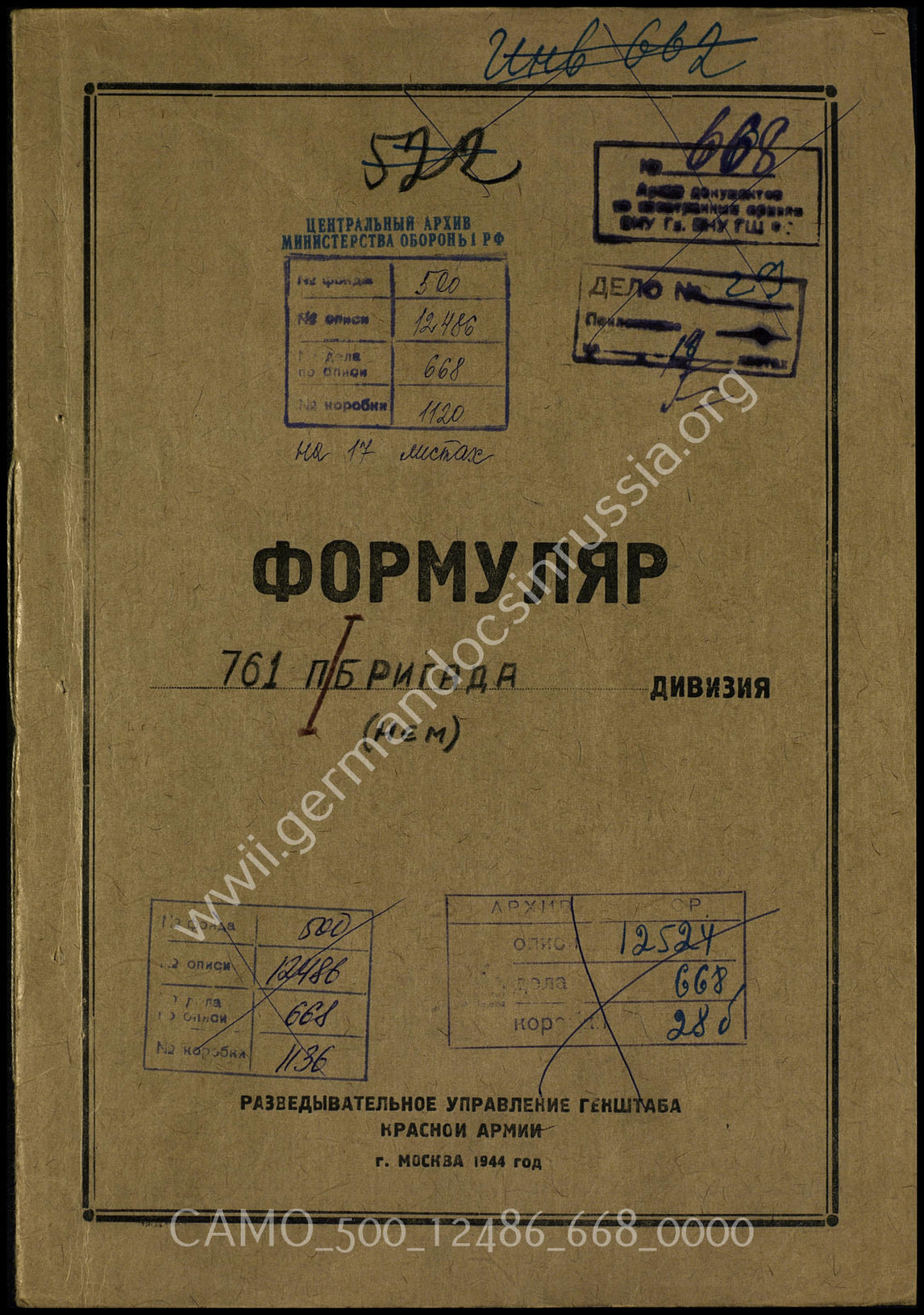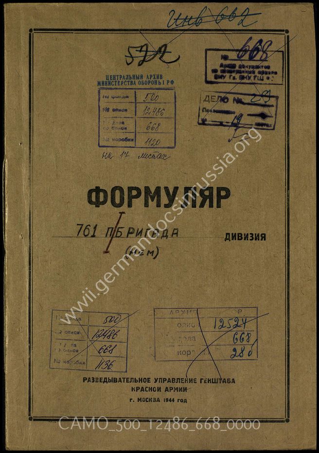 Дело 668: Документы Разведывательного Управления Генерального штаба Красной Армии: формуляр с развединформацией 761-й гренадерской бригады (в советских документах числится как 761-я пехотная бригада), справочные данные, допросы военнопленных и проч.