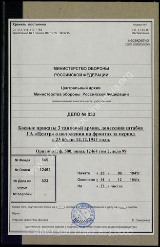 Дело 823: Документы военно-исторического управления ГШ ВС СССР: перевод приложений к жбд группы армий «Центр» - оперативный отдел – документ VI – донесения и предложения армий, том А, 3-я танковая группа часть 1, 23.06.1941 – 14.12.1941 г.