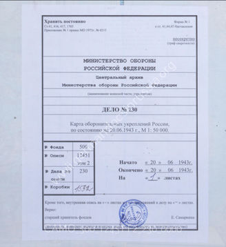 Akte 230: Unterlagen der Vermessungs- und Kartenabteilung (mot.) 618: Befestigungskarte (O-36-121) des Raums Nowosokolniki (Kleinstadt im Oblast Pskow), M 1:50.000, Stand 20. Juni 1943
