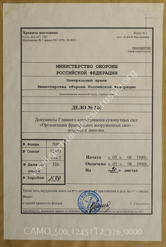 Akte 326: Unterlagen der Abteilung Fremde Heere West beim Generalstab des Heeres im OKH: Neue Korps- und Divisionslisten (Stand 5. Juni 1940) zu „Die Gliederung des französischen Kriegsheeres“ (2. Anhang zu Nr. 2000/40 geh.)