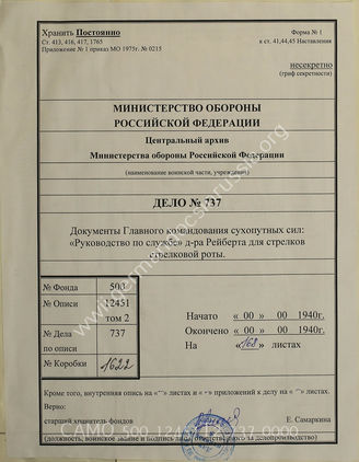 Akte 737: Reibert: Der Dienstunterricht im Heere. Ausgabe für den Schützen der Schützenkompanie, 12. neubearbeitete Auflage, Berlin 1940