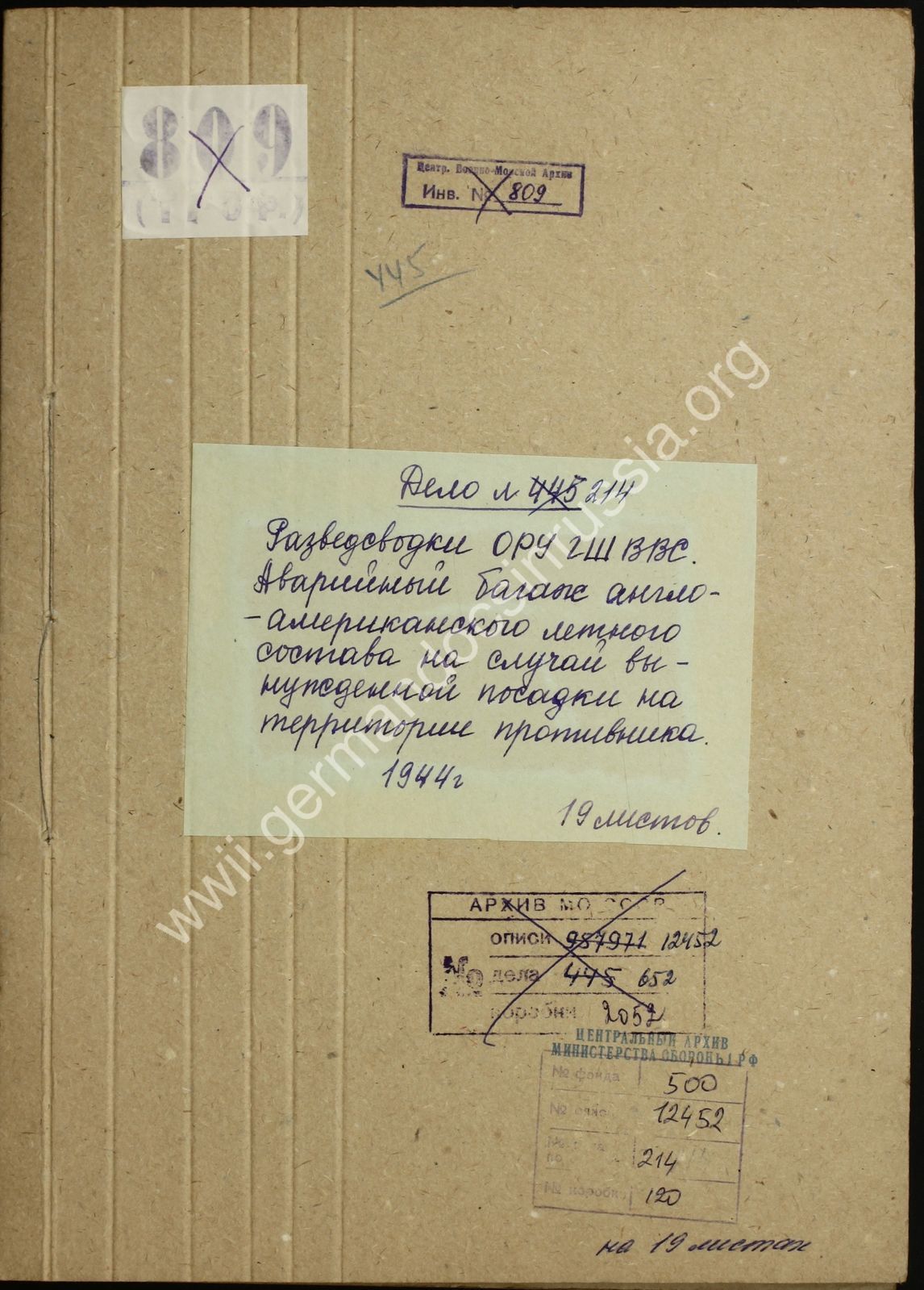 Дело 214. Информационный листок службы иностранной авиации (Запад) штаба оперативного руководства ВВС о снаряжении англо-американского летного персонала на случай вынужденной посадки на территории противника.