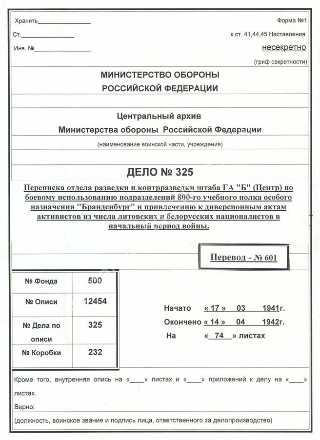 Дело 325. Документы разведывательного отдела группы армий "Центр": Переписка по боевому использованию 800 –го учебного полка особого назначения "Бранденбург" в районе действия группы армий.