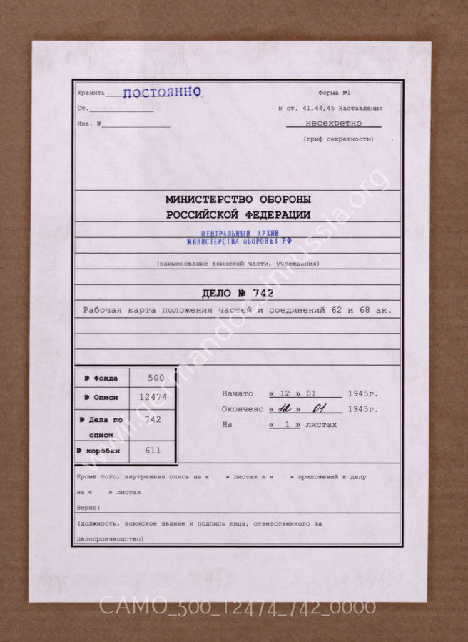 Дело 742. Карта положения 42-го армейского корпуса и 48-го танкового корпуса в районе Радом к началу Висло - Одерской операции, по состоянию на 12.01.1945 г., М 1: 300 000.