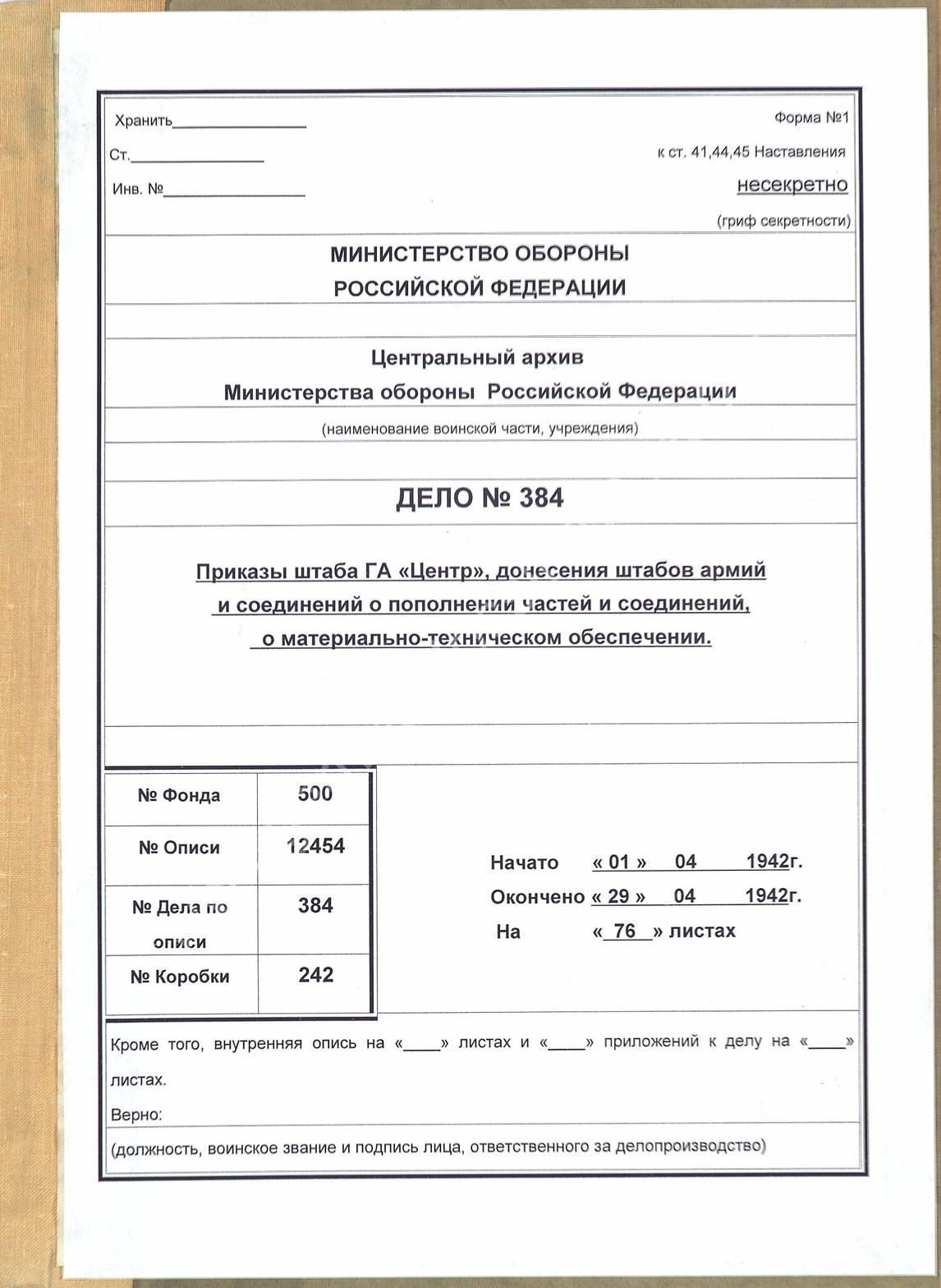 Дело 384. Приказы Генерального штаба группы армий "Центр" и отчеты штаба армии и дивизий относительно пополнения войск и по вопросам материально-технического обеспечения.