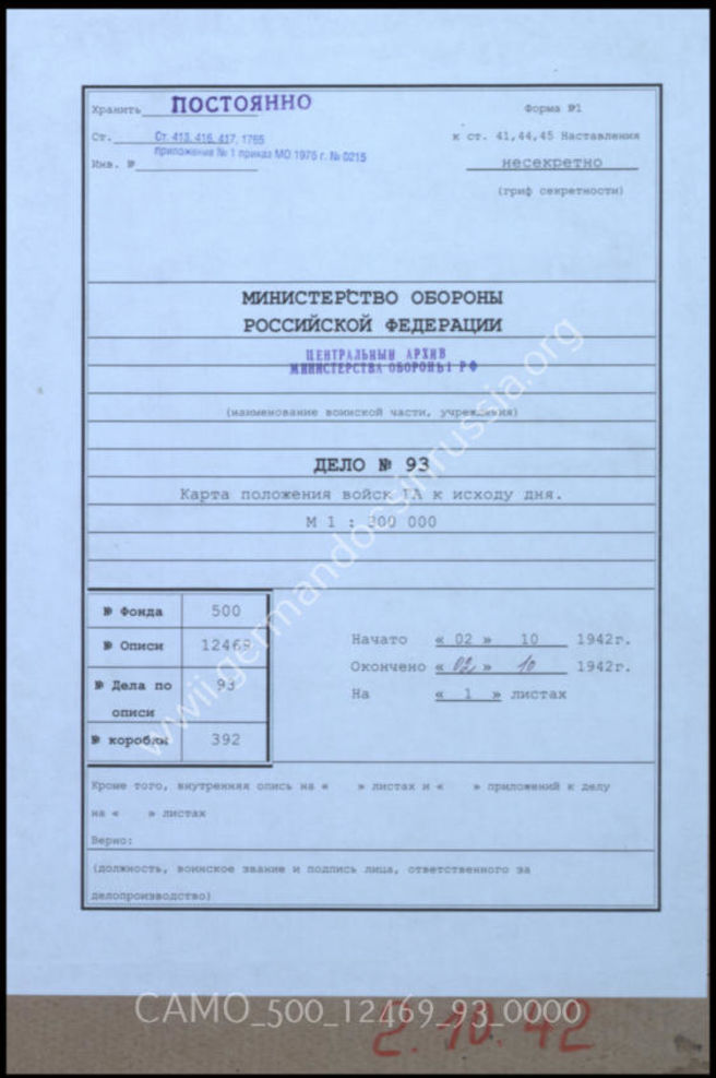 Дело 93. Документы отдела IIIb оперативного управления Генерального штаба сухопутных сил при ОКХ: карта положения частей группы армий «А» и Красной Армии, по состоянию на 02.10.1942 г. – вечер, М 1: 300 000.