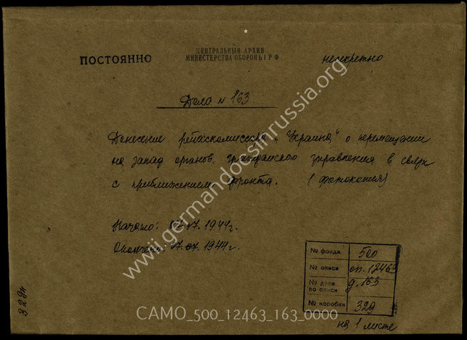 Дело 163. Сообщение рейхскомиссара Украины об эвакуации и положении в прифронтовых областях.