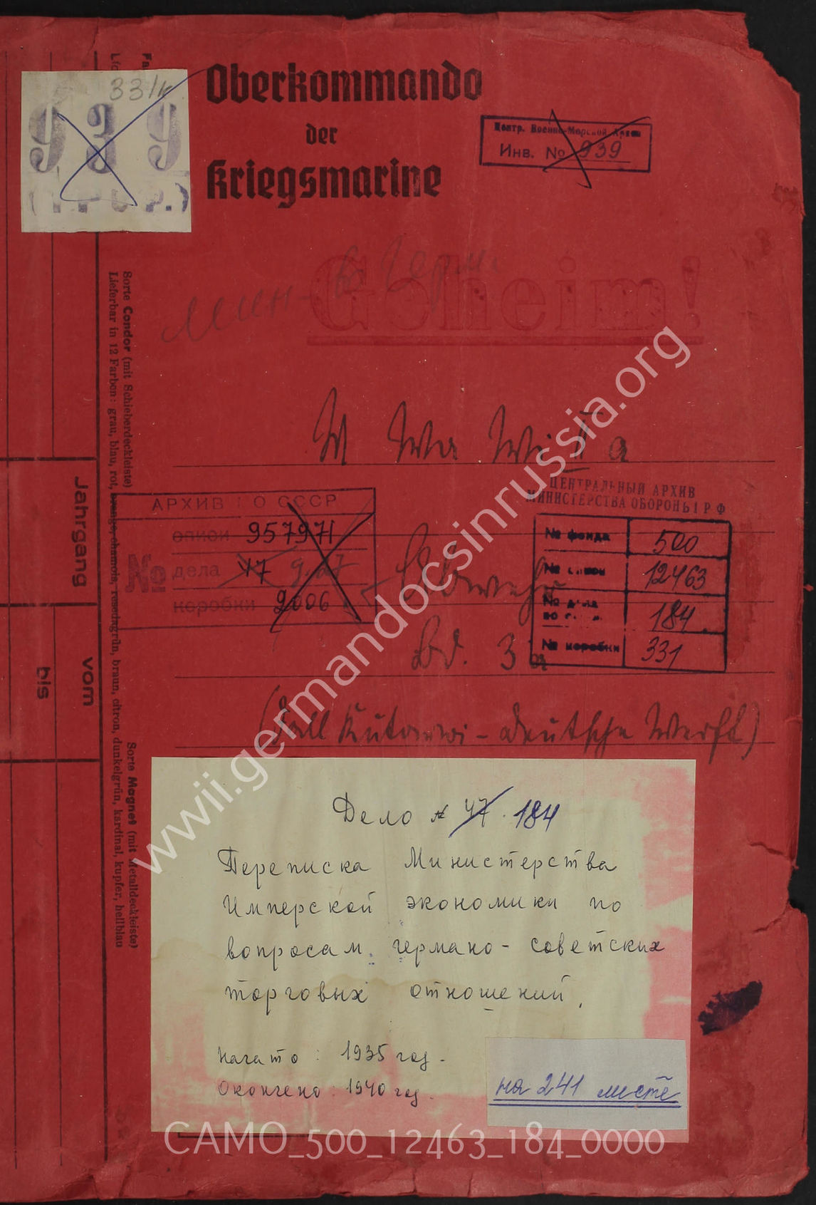 Дело 184. Переписка Бюро по германо-советскому товарообмену в Имперском министерстве экономики с советским торговым представительством в Германии, переписка ОКМ, ОКВ, министерства экономики...