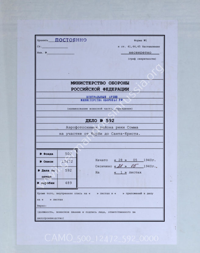 Дело 592. Документы командующего ВВС при 9-й армии: отдел аэрофоторазведки – аэрофотосхема р. Сомма на участке от Корби до Сен – Крайста– М 1: 30 000.
