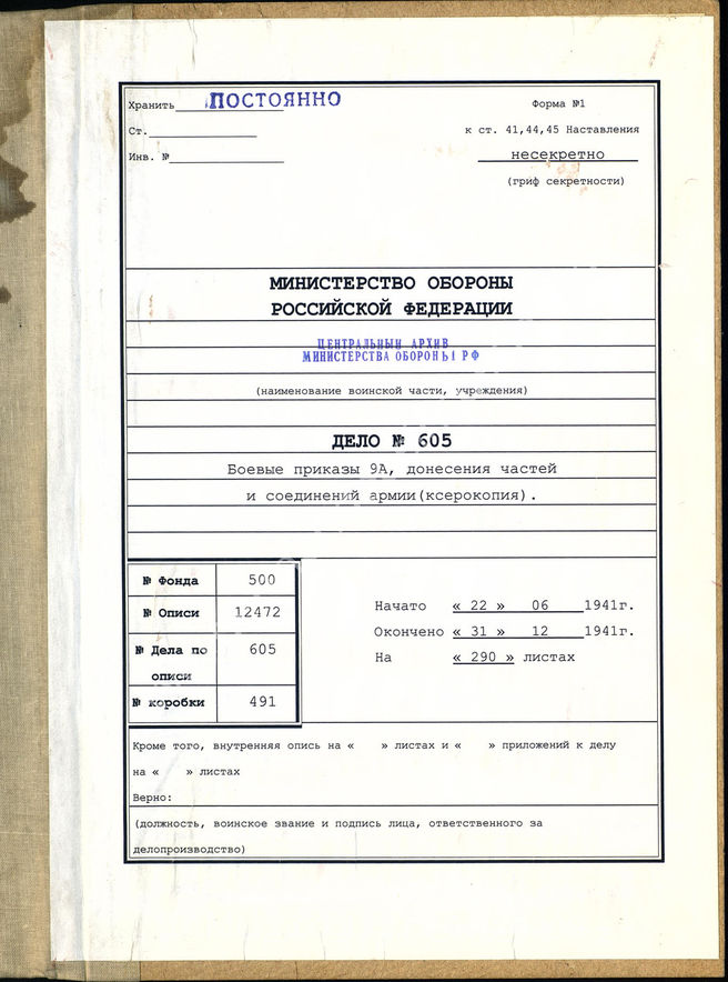 Дело 605. Документы оперативного отдела штаба 9-й армии: приложения к журналу боевых действий 9-й армии – приказы, распоряжения и телеграммы группы армий «Центр» в штаб 9-й армии для проведения военной кампании против СССР...