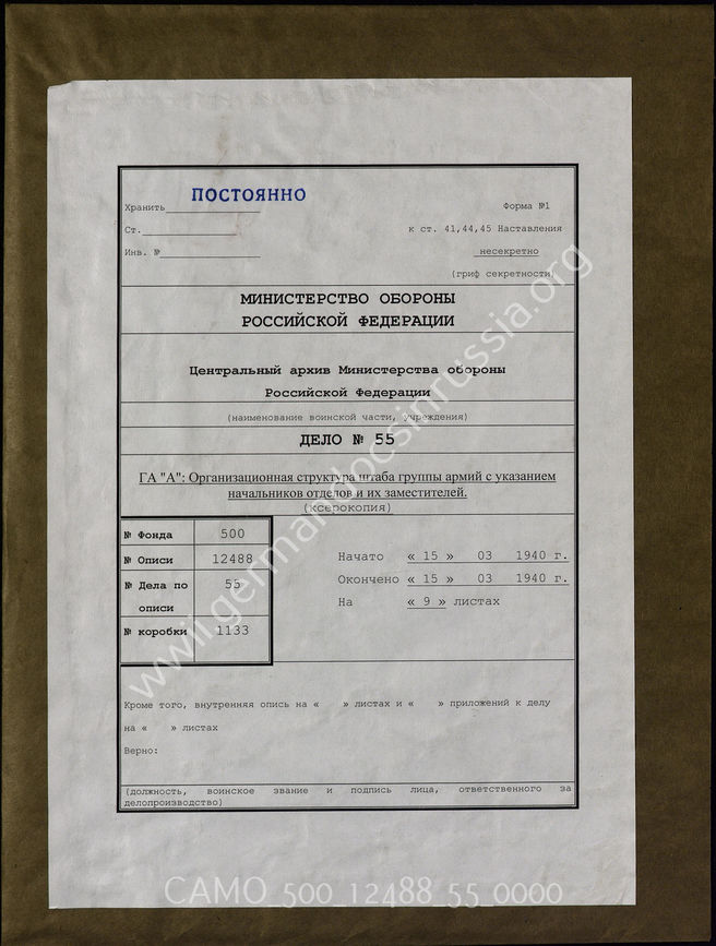 Дело 55: Документация Ia-департамента группы армий А: распределение работы оперативного управления и департамента генерал-квартирмейстера группы армий A, состояние на 15.3.1940 (2-й экземпляр)