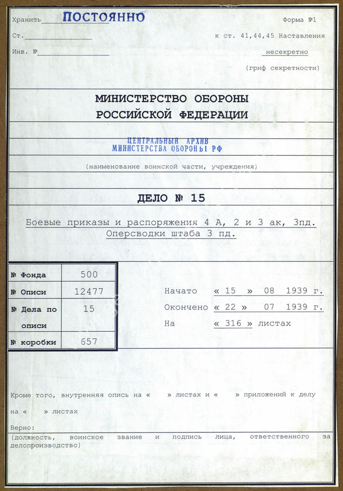 Дело 15. Документы оперативного отдела 3-й пехотной дивизии: распоряжения и приказы подчиненным частям, приказы по корпусу, тактические донесения от подчиненных подразделений и частей, распоряжения о расквартировании войск...