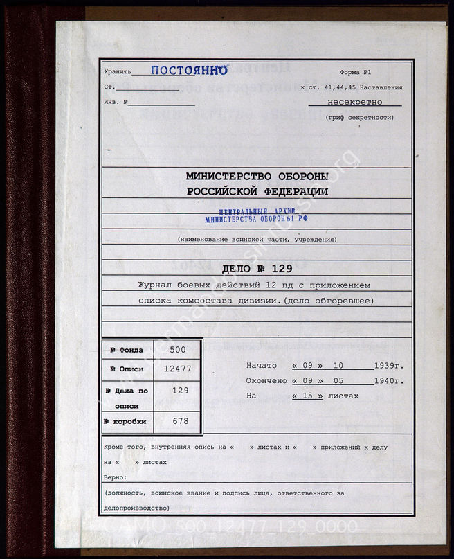 Дело 129. Документы оперативного отдела 12-й пехотной дивизии: журнал боевых действий 12-й пехотной дивизии за 14.10.1939 – 09.05.1940 гг.; журнал боевых действий только до 15.11.1940 г.