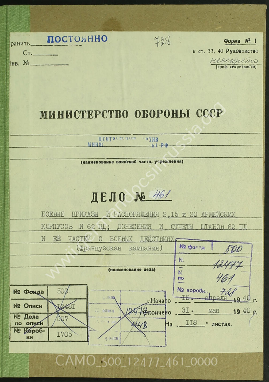 Дело 461. Документы оперативного отдела 62-й пехотной дивизии: приказы по дивизии о наступлении на Бельгию и Францию, тактические донесения и радиограммы полков дивизии...