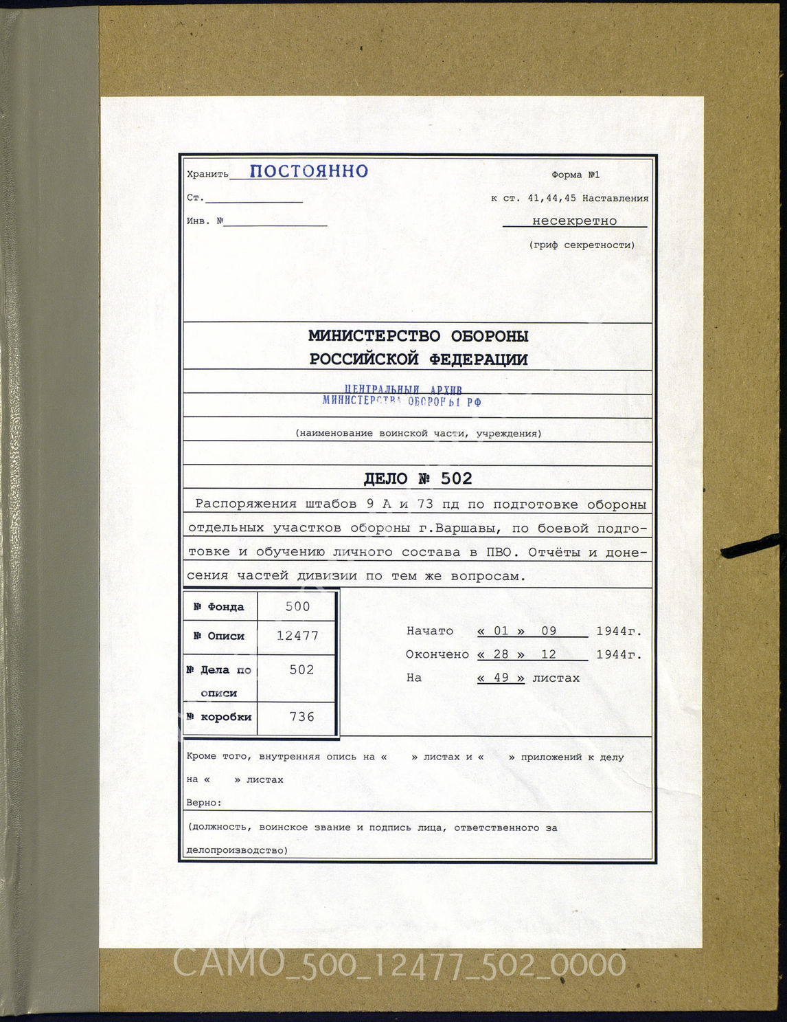 Дело 502. Документы оперативной части 173-го противотанкового дивизиона 73-й пехотной дивизии: материалы о рекогносцировке местности на Висле в районе Варшавы, планы боевой подготовки по ведению противотанковой и противовоздушной обороны...