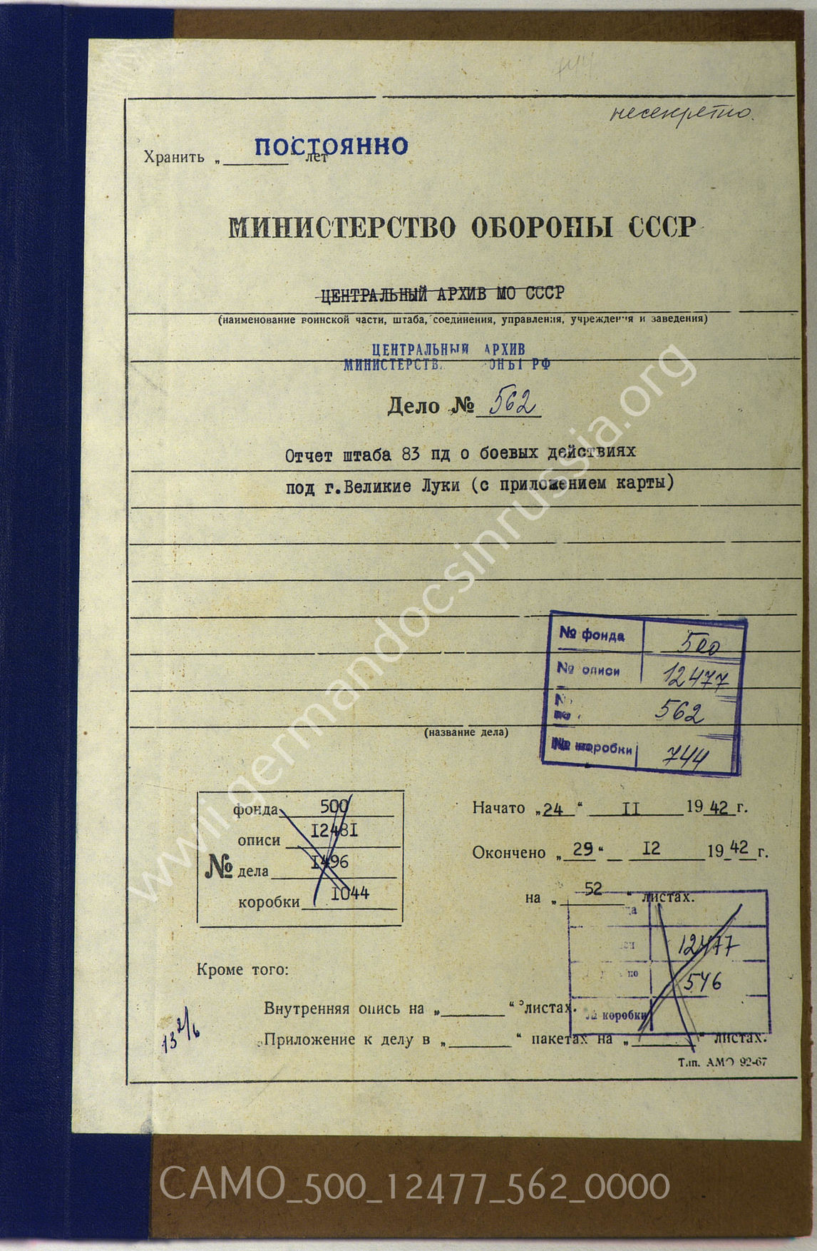 Дело 562. Документы оперативного отдела 83-й пехотной дивизии: обзор боевых действий дивизии под Великими Луками за 24.11. – 29.12.1942 г.