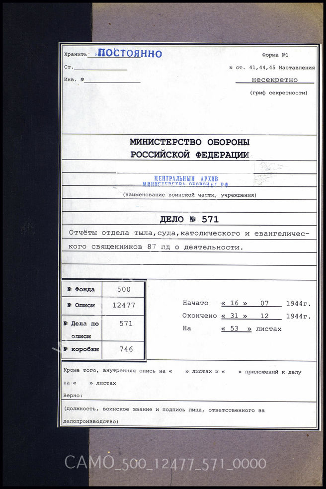 Дело 571. Документы отдела тыла 87-й пехотной дивизии: отчеты о служебной деятельности различных служб отдела тыла...