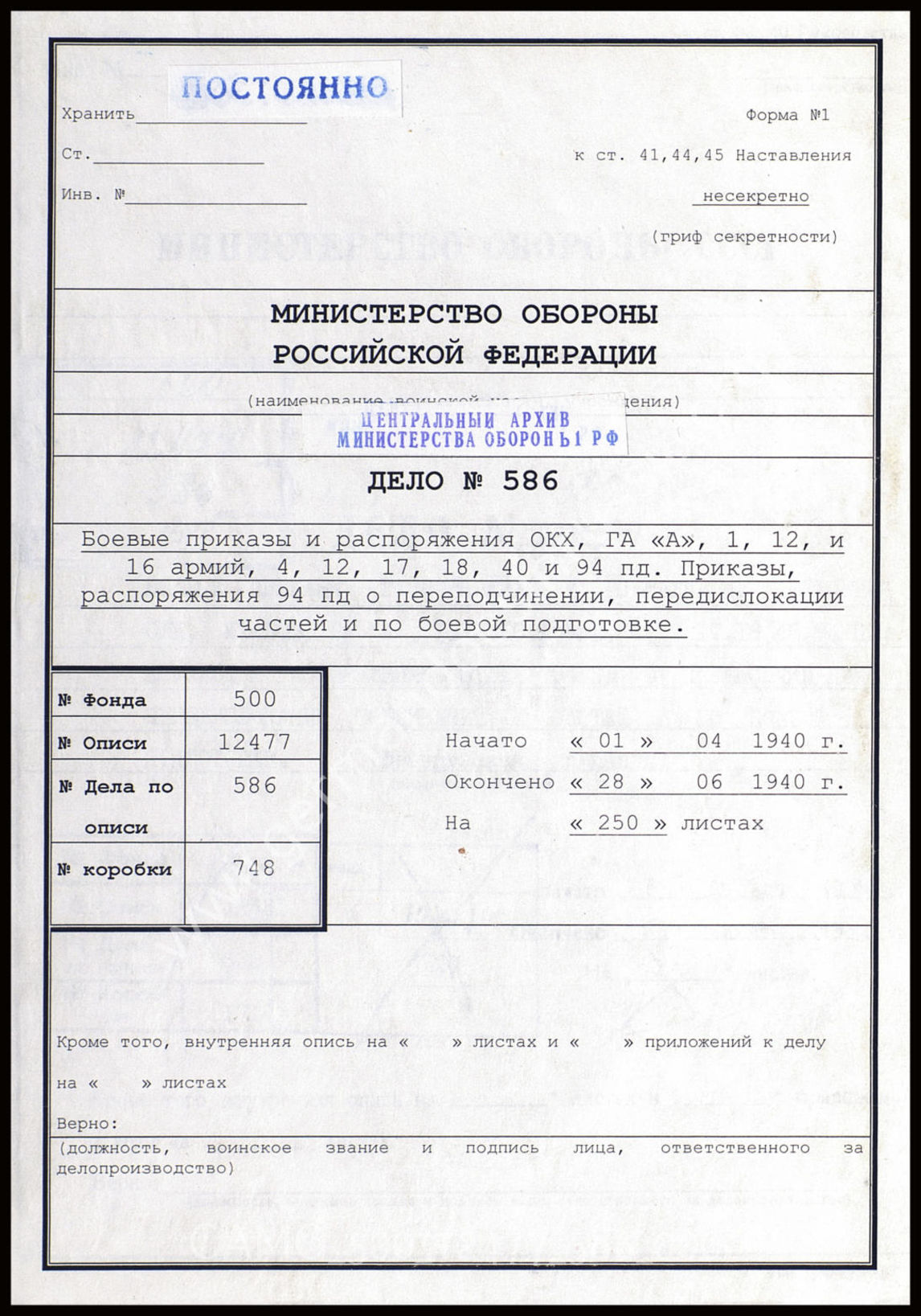Дело 586. Документы оперативного отдела 94-й пехотной дивизии: приложения к журналу боевых действий № 2 дивизии, том 1 – обзорные сведения по организационной структуре, приказы группы армий «А»...