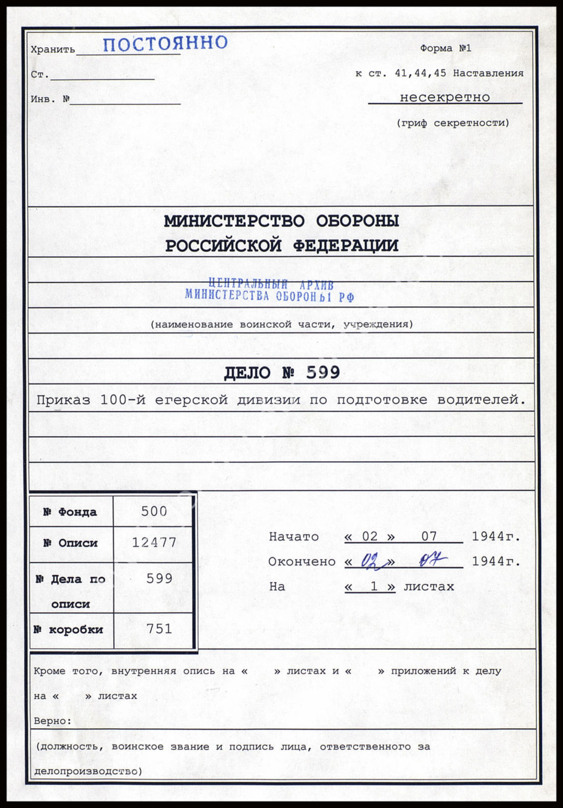 Дело 599. Документы отдела кадров 100-й егерской дивизии: указание Главного командования сухопутных сил к донесению об использовании обученных водителей.