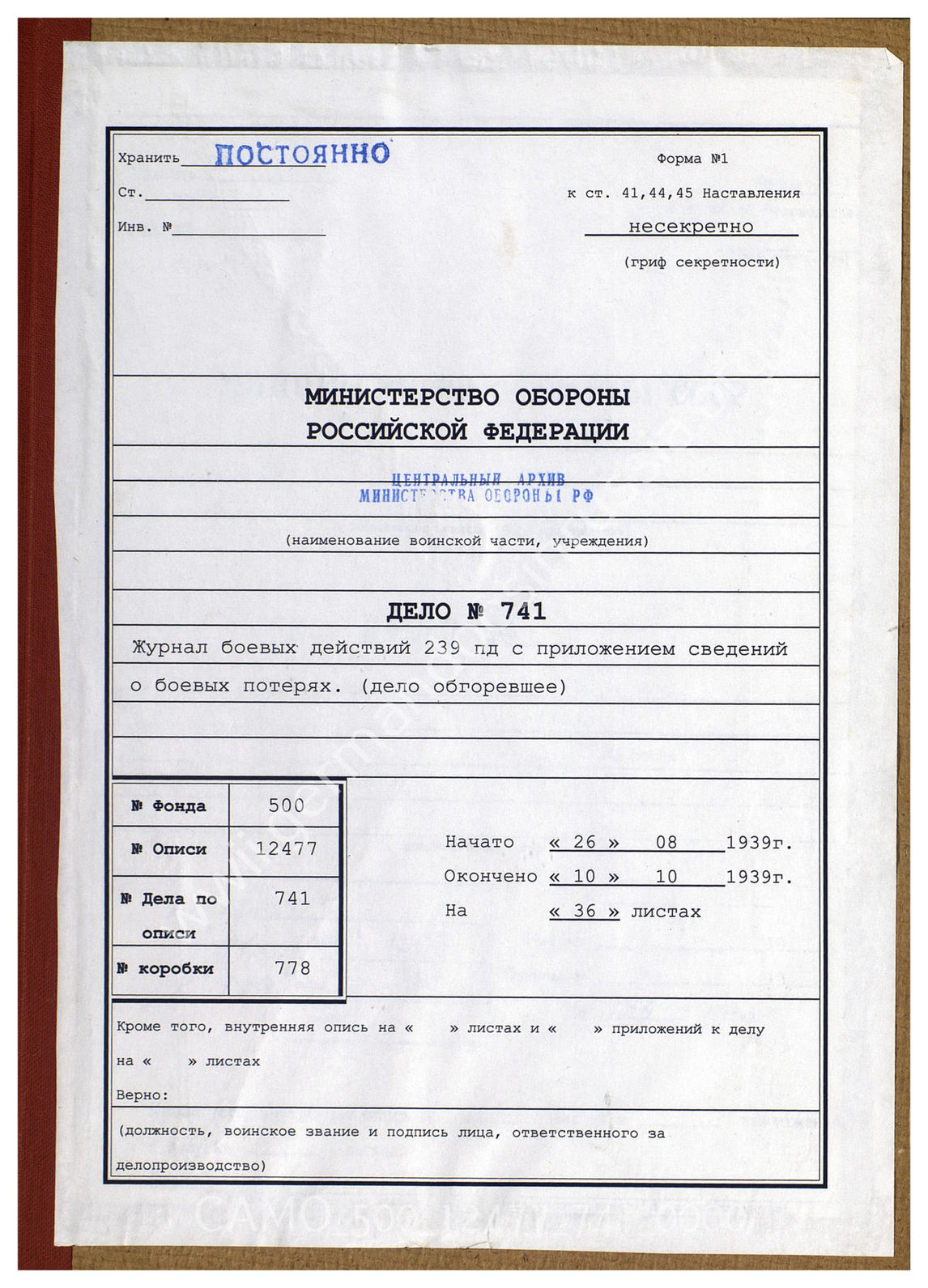 Дело 741. Документы оперативного отдела 239-й пехотной дивизии: журнал боевых действий № 1 оперативного штаба 239-й пехотной дивизии во время наступления на Польшу за 26.08. – 10.10.1939 г...