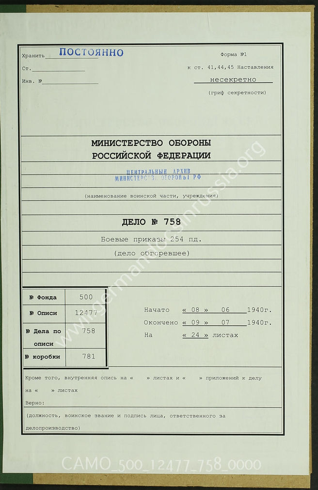 Top Фонд 500 Опись 12477 - Пехотные и охранные дивизии вермахта, 1934 - 1945 гг. Дело 758. Документы оперативного отдела 254-й пехотной дивизии: отч...