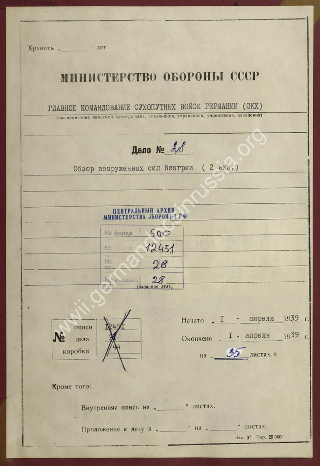 Дело 28. Обзор вооруженных сил Венгрии по состоянию на 01.04.1939 г. (2 экз.)