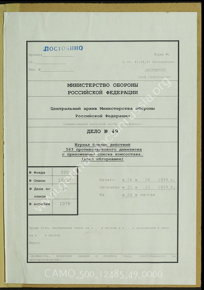Top Фонд 500 Опись 12485 - Артиллерийские, разведывательные, противотанковые и з... Дело 49. Документы оперативной части 563-го противотанкового дивизи...