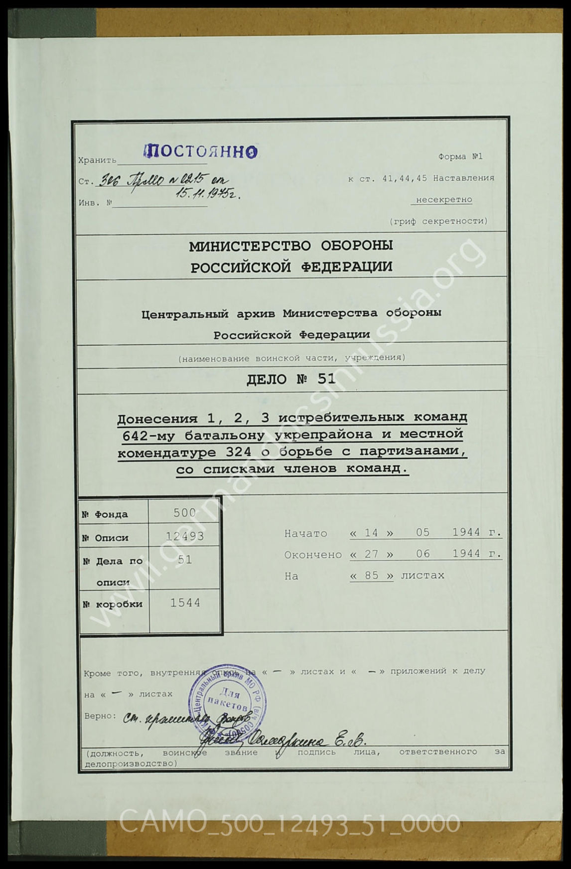 Дело 51. Документы истребительных команд 642-го батальона укрепленного района: донесения 1-й, 2-й и 3-й истребительных команд 642-го батальона укрепленного района в 324-ю гарнизонную комендатуру об отдельных операциях против партизан...