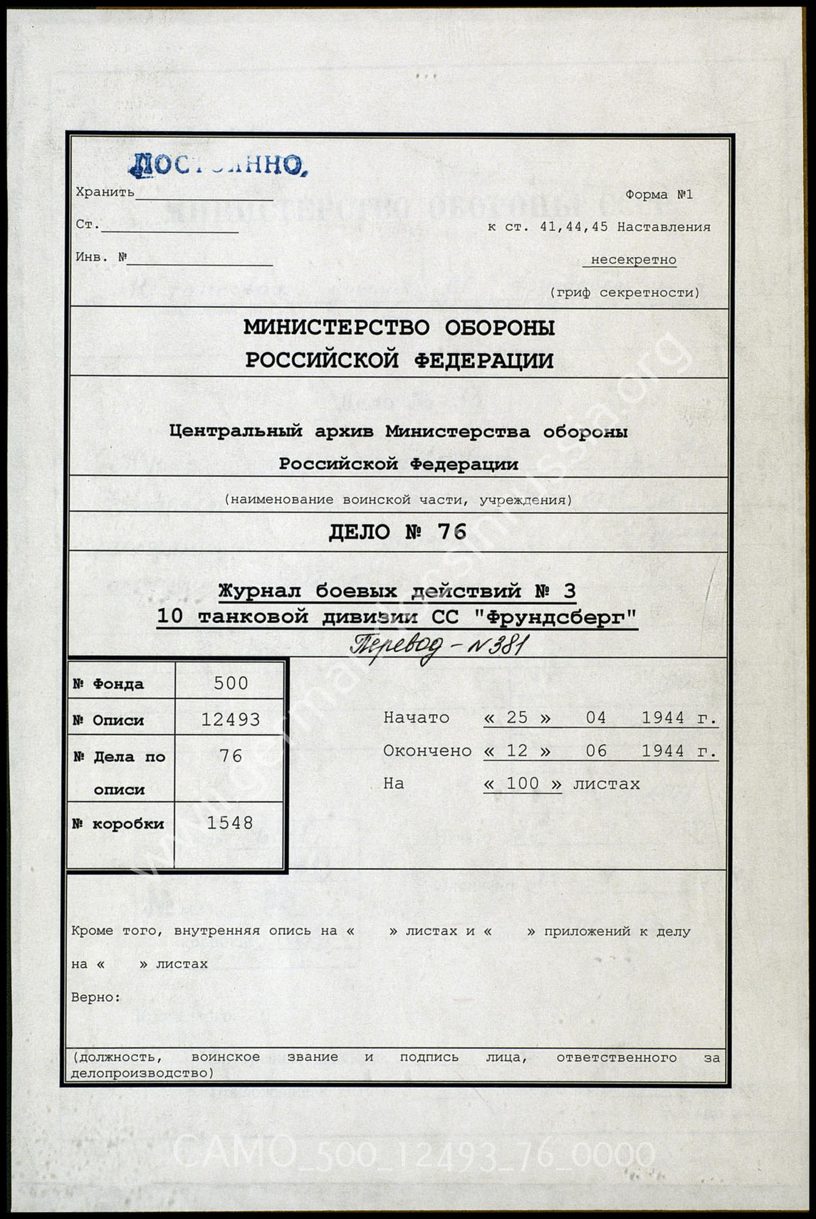 Дело 76. Документы оперативного отдела 10-й танковой дивизии СС «Фрундсберг»: журнал боевых действий № 3 штаба 10-й танковой дивизии СС «Фрундсберг» - боевые действия на «Востоке», с приложениями.